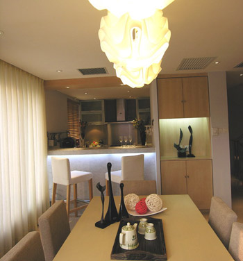 廚房在生活的比喻中,一直有“鍋碗瓢盆”奏鳴曲的美名。如何讓這首曲子奏得歡暢,第一要保證有足夠的亮度,尤其是在操作區(qū)不能有陰影和眩光,這關系到你在揮灑刀功的同時,不會傷害到手指。例如采用嵌入式熒光燈或吸頂燈能提供柔和宜人的光色,既可還原食物的色彩,又能凸顯廚房的明凈感。