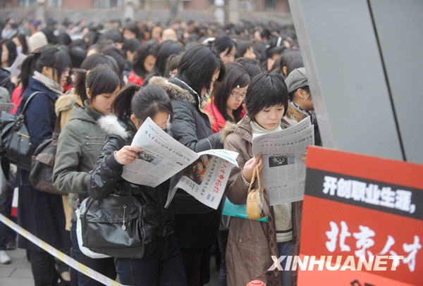 3月4日,參加招聘的女大學(xué)生在北京市畢業(yè)生就業(yè)市場排隊(duì)等候入場。當(dāng)日,北京市2009年女大學(xué)生專場招聘會在北京市畢業(yè)生就業(yè)市場舉辦,北京各行業(yè)近50家企事業(yè)單位共推出600余個崗位,吸引了5000多名女大學(xué)生入場。據(jù)介紹,這是北京市連續(xù)第5年舉辦女大學(xué)生專場招聘會。主辦方表示,此次進(jìn)場的所有崗位都是針對女大學(xué)生設(shè)立。2009年北京地區(qū)將有高校畢業(yè)生21萬余人,北京生源畢業(yè)生達(dá)到9萬多,其中女大學(xué)生比例超過五成。新華社記者 羅曉光攝