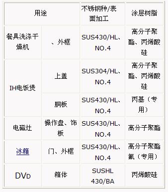 隨著不銹鋼用途的擴(kuò)大,在家電用途方面,指紋污染和食品、藥品等的腐蝕問(wèn)題已不容忽視,對(duì)此需實(shí)施樹(shù)脂涂層。但是,以往的著色涂層會(huì)損失不銹鋼特有的金屬光澤和觀賞性。因此,近幾年來(lái)在防止指紋污染和腐蝕的同時(shí),還開(kāi)發(fā)了觀賞性優(yōu)良的透明涂層不銹鋼,使其在冰箱 、餐具清洗干燥機(jī)、IH電飯煲和電磁爐等家電的外裝飾方面被廣泛使用。