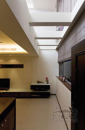設(shè)計(jì)團(tuán)隊(duì)考慮如何展現(xiàn)躍層的好條件?在串聯(lián)1、2樓樓板部 分,經(jīng)過結(jié)構(gòu)估算,以強(qiáng)化玻璃處理,增加空間透視效果,使 得大片落地窗一氣喝成從2樓貫穿至1樓,更能夠感受出躍層 的空間感氣度。