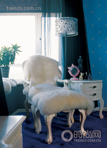 臥室吉米特別強(qiáng)調(diào)了色彩在功能性上所起的作用,因?yàn)榕P室如果用紅和綠會比較亢奮,不能馬上進(jìn)入睡眠狀態(tài)。于是,吉米選擇了深色,吊燈有點(diǎn)發(fā)紫,地毯也是紫藍(lán)的顏色,窗簾又是黑色。到家累了,一拉窗簾,完全就是休息的氛圍。但是床上用品和家具,吉米選擇了白色,這樣就不會那么悶