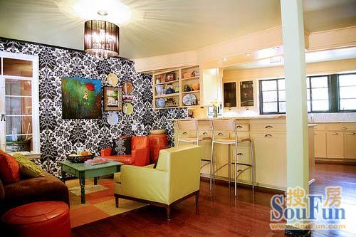 休閑區(qū)的一角——一巴洛克風(fēng)格的壁紙點(diǎn)綴色彩豐富的裝飾,紅色的沙發(fā)、蒲團(tuán)讓空間呈現(xiàn)出多層次的色彩維度。開放式廚房設(shè)計(jì)讓空間顯得明亮寬闊,白楓木的櫥柜設(shè)計(jì)兼具了吧臺(tái)功能。