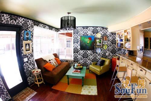 休閑區(qū)全景——色彩拼接的格子地毯、綠色的桌子、棕色的布藝沙發(fā)讓空間女人味十足。