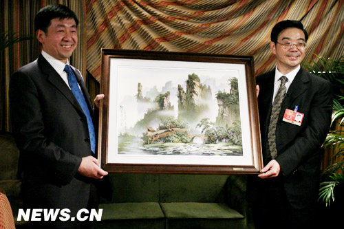 3月7日,湖南省省長周強(qiáng)接受新華網(wǎng)專訪。 圖為周強(qiáng)向網(wǎng)友贈(zèng)送湖南張家界特有的沙石畫禮品。 新華網(wǎng) 馬軼群 攝