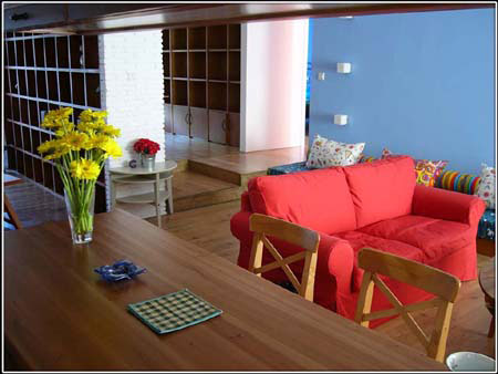 5.把尖角中間的一截掏空,設(shè)置一個弧形的多層木制花臺,放幾盆鮮潤的植物,小品并用射燈照明,這樣,既避免了以尖銳示人,也使家中頓添盎生趣,化弊為利,成為家中一個觀景的亮點(diǎn)。