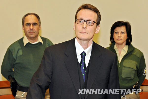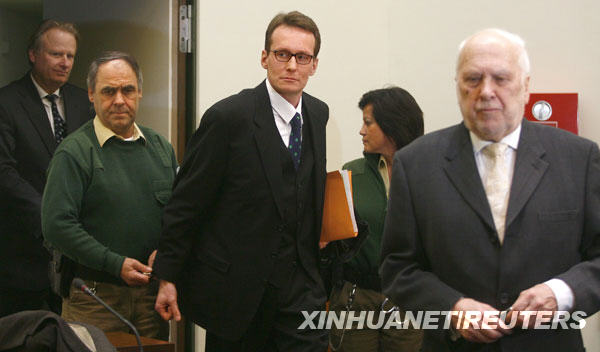 3月9日,瑞士男子黑爾格·斯加爾比(中)在律師的陪同下來(lái)到德國(guó)慕尼黑的法庭接受審判。新華社/路透