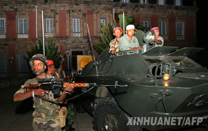 當地時間16日晚約7時,武裝部隊向位于市中心一座山上的總統(tǒng)府發(fā)起攻擊,首先發(fā)射了兩枚火箭彈,并鳴槍警告總統(tǒng)府守衛(wèi)部隊,隨后用擴音器朝守衛(wèi)部隊喊話,要求他們投降。早已在總統(tǒng)府附近待命的兩輛裝甲車隨即開了過來,撞開了總統(tǒng)府的鐵柵欄門。