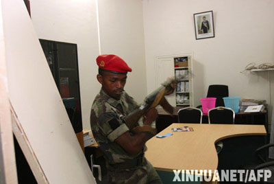 3月16日,一名馬達加斯加武裝部隊士兵持槍進入位于塔那那利佛市的一處總統(tǒng)府辦公室。當晚,馬達加斯加武裝部隊占領了位于塔那那利佛市中心的總統(tǒng)府,接管過程中發(fā)生沖突,總統(tǒng)府附近的中央銀行大樓遭到炮擊。 新華社/法新