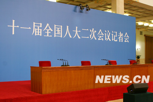 2009年3月13日,十一屆全國人大二次會議在京閉幕。國務(wù)院總理***在閉幕會后會見中外記者。今年記者會的現(xiàn)場與往年有一個明顯的不同,主席臺上沒有布置鮮花和綠植,簡潔的桌面讓人一目了然。圖為記者會現(xiàn)場。馬軼群 攝