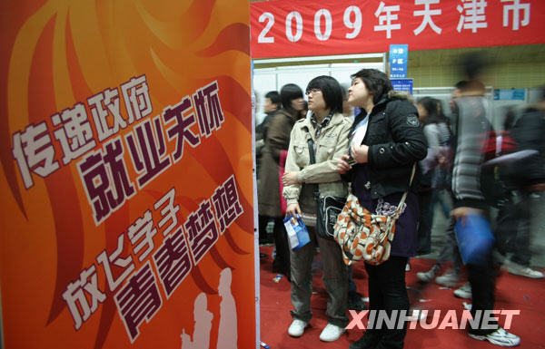 資料圖片:3月8日,在天津市高校畢業(yè)生專場(chǎng)招聘會(huì)現(xiàn)場(chǎng),兩名應(yīng)聘者駐足觀看招聘信息。 新華社發(fā)(李想 攝)