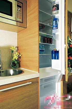 嵌入式冰箱保證居室風(fēng)格統(tǒng)一嵌入式冰箱被嵌入操作臺(tái)的一側(cè),冰箱外部貼上與櫥柜門相同的材質(zhì)。