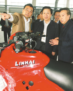 昨天(19日),在林海動(dòng)力機(jī)械集團(tuán),江蘇省委書(shū)記梁保華饒有興致地參觀了該公司開(kāi)發(fā)的摩托車、割草機(jī)、發(fā)電機(jī)等各式新產(chǎn)品。記者 于先云攝