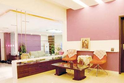 客廳主題顏色確定后,屋子的其它部分色彩也隨之確定。玄關(guān)處一側(cè)為廚房的外墻,用石膏板做成條狀,全部為紫色,在中間裝上落地鏡,既實用,又能擴展空間。另一側(cè)的鞋柜如果用紫色會顯得沒有層次,可以用色調(diào)接近的胡桃色,而墻垛則與另一側(cè)相協(xié)調(diào)均為紫色橫條。