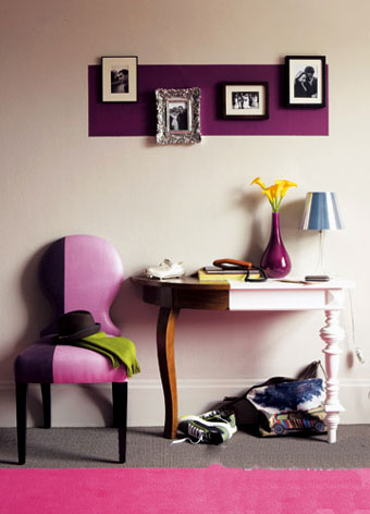 對于原本是米白色和木色系為主的玄關(guān)處,可以在墻面、家具和地面上直接加入漿果色系的顏色,就能馬上獲得全新視覺效果。邊桌上紫色的花瓶必不可少,家居色彩運(yùn)用的最高境界就是在所有擺設(shè)之間找到平衡。