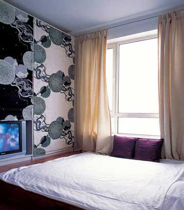 黑白花色的簾子后面是實用的儲物區(qū)域,這樣才使得臥室呈現(xiàn)出一派寫意氣質(zhì)。