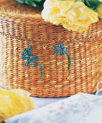 用藤條編織的收納籃子,紋路清晰明了,并且有空隙,所以很容易在上面繡上各種圖案。籃子上的花朵和細(xì)枝,以及細(xì)密的十字形點綴圖案繡法都十分簡單易行。如果家中有這種編織方式的籃子,可以嘗試用這種方法裝飾一下。