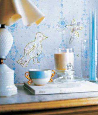 概要: 一說起刺繡,人們往往會想到在布料上繡出各種圖案。其實,只要是針線可通過的材料,都可以在上面進(jìn)行刺繡?! ∮袥]有想過印花壁紙上出現(xiàn)刺繡圖案會是怎樣的一種效果呢。把手工刺繡的花鳥圖案粘貼在壁紙上,會使空間看上去更加柔和,并富有意境?! ∠劝巡剂霞舫尚枰男螤?,然后用不同顏色的彩線進(jìn)行刺繡,使用浮雕效果針腳法繡鳥的身體,鳥嘴和鳥爪用了陰影針腳法。