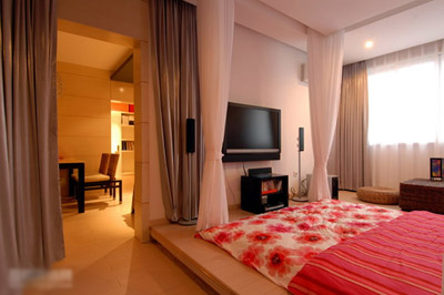 “地臺”使睡眠區(qū)的環(huán)境更為清潔。在擺放床的地域處,裝修出10公分左右高的木質“地臺”,相應地選用較低矮的床。其效果是:使睡眠區(qū)的環(huán)境更為清潔;地臺烘托中的床與人更有一種“精品”的藝術美感;尤其是花梨木質的地臺還可給人以芬芳的氣息。