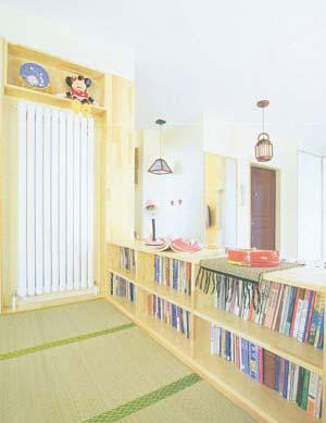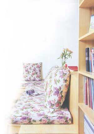 因?yàn)榭蛷d和臥室的面積都不夠大,于是,在家裝設(shè)計(jì)時(shí)把客廳和臥室之間的墻拆掉了,取而代之的是一排低矮書柜。挨著低矮書柜的位置打造了一個(gè)轉(zhuǎn)角的寬臺(tái),在上面擺放了一個(gè)坐墊,寬臺(tái)很自然地就成了沙發(fā)的坐面,而低矮書柜配上靠墊就是沙發(fā)的靠背,舒適的轉(zhuǎn)角沙發(fā)赫然出現(xiàn)在眼前。