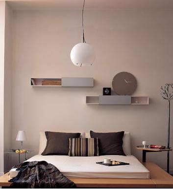 利落的線條充滿整個房間,原木色的寬邊床可移動的小幾設(shè)計周到,背景墻上錯落安置的CD架,利用材料的多元變化和幾何造型的有機融入,讓視覺呈現(xiàn)出舒緩的起伏,金屬衣架豎立要床旁,既實用又強調(diào)了空間的設(shè)計感。
