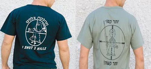 欠妥T恤衫圖案描繪了以色列與巴勒斯坦的武裝沖突,其中不乏有辱巴勒斯坦人的內(nèi)容。系列T恤中的一款印畫著一名在瞄準(zhǔn)器內(nèi)的巴勒斯坦小男孩,圖配標(biāo)語(yǔ)“越是個(gè)兒小,越難對(duì)付”。