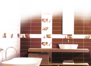 馬桶上方的墻面沒(méi)有很多空間可以自由發(fā)揮,而且還要和馬桶搭配和諧。六片花磚組成的一組圖案,在設(shè)計(jì)中加入一些卡通的概念在里面,是使空間變得活潑的一種方法,而且在運(yùn)用時(shí)宜精不宜多。