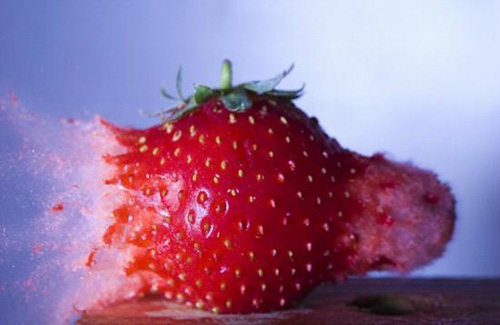 .賽勒利用激光器觸發(fā)相機(jī)快門,以慢鏡頭捕捉到小球穿透草莓的瞬間
