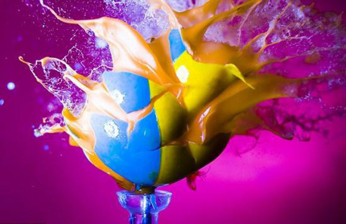 彩球爆炸,里面的液體四處飛濺,此景就像是一個(gè)彩色的萬花筒