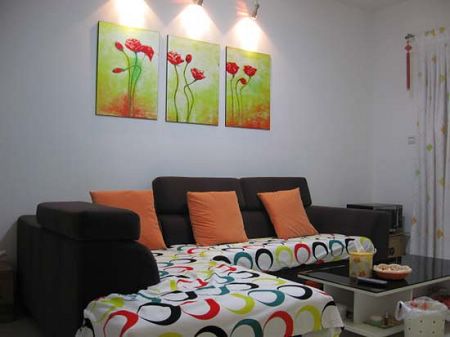 我家的墻面基本上都是白色,然后用些裝飾品點(diǎn)綴,墻上掛的裝飾畫剛好點(diǎn)綴了灰白色調(diào)的客廳,這樣的客廳簡潔大方,樸素不顯呆板。沙發(fā)選用的是金葉布藝沙發(fā),使用了一段時(shí)間,感覺還是不錯(cuò)的,茶幾是優(yōu)美家的,下面有格子可以用來放小物品,上面是鋼化玻璃。