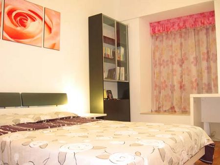 主人房的圖片,恒大家私優(yōu)美家1.5m床、床頭柜、1.5m長書桌,穗寶南國之春床墊、紅蘋果黑橡書柜、雅芳婷床上用品、紡韓絲窗簾、畫龍無框畫。