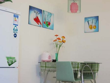 這就是餐廳,我家的餐廳是比較簡潔的,前期沒有畫和花的時(shí)候顯得有些單調(diào),同樣我也是選用掛畫做為點(diǎn)綴,然后用一束菊花作為襯托,讓人坐在餐桌上非常有食欲。