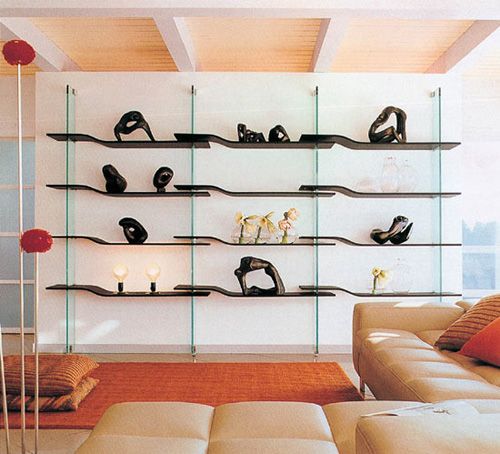 客廳擱架主要突出其展示功能,而擱架的本身設(shè)計(jì)要么前衛(wèi)時(shí)尚,要么和整體家居風(fēng)格一致,而擱架最好為開放式,可以放置一些具有觀賞效果的小件物品,對(duì)整個(gè)客廳的裝飾起到提點(diǎn)作用。