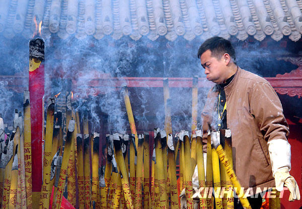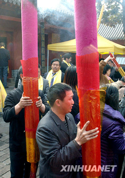 3月29日,在河南省新鄭市黃帝故里景區(qū)正殿前,香客們圍著燭臺點香。當日是農(nóng)歷三月初三,相傳是中華民族人文始祖黃帝出生的日子,人們紛紛到黃帝故里進香祈福。
