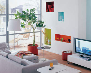 在墻上挖幾個方塊,刷上鮮艷的色彩,擺放進(jìn)鮮艷的飾品,另一半墻上則是帶灰色的淺色條紋組合。這是屬于色彩圖A和色彩圖B的顏色組合的案例,由于選用的都是亮度較高的顏色,而且是多種顏色小范圍組合,所以搭配起來也顯得諧調(diào)。