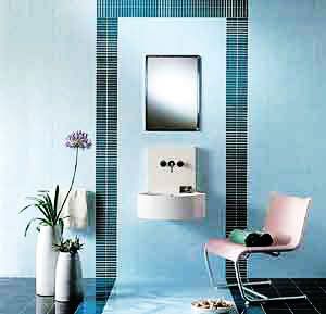 面積稍小的衛(wèi)浴間,由于空間比較局促,無法安排下淋浴房或浴缸,一個(gè)簡單的淋浴花灑即構(gòu)成淋浴區(qū),即便如此,這個(gè)簡單的小淋浴區(qū)也同樣可以使用彩磚+花磚的辦法,亮麗起來。
