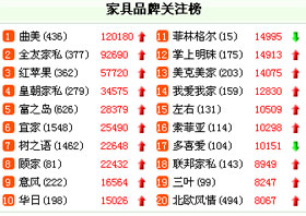 圖二是截至4月8日的家具品牌關(guān)注榜及關(guān)注度top10分布圖,跟圖一相比我們不難看出,品牌關(guān)注榜的普遍關(guān)注度均走上升趨勢(shì),排行第一由原來(lái)7萬(wàn)增長(zhǎng)到了十二萬(wàn),北方家具曲美超越了四川的全友榮登第一寶座,而緊跟其后的依然是全友、紅蘋(píng)果、皇朝等知名品牌家具企業(yè)。值得一提的是富之島家具由上月的排名第八竄升到本月前五名,關(guān)注度也大幅上漲。