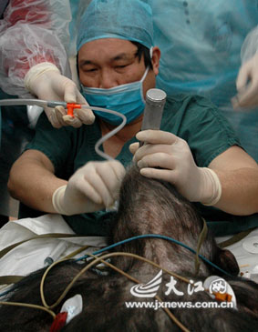 昌大一附醫(yī)院副院長王共先告訴記者,由于黑猩猩與人的構(gòu)造不一樣,給手術(shù)帶來了一定的麻煩。如插入輸精管時,剛一**去,卻發(fā)現(xiàn)不對,是尿道,不是**;還有,輸精管開始是按人用的長度標(biāo)準(zhǔn)使用的,后來發(fā)現(xiàn)短了。不過,這些小麻煩都被一一解決了。