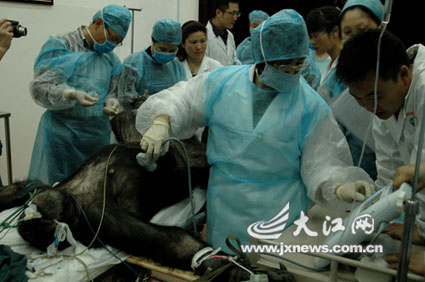 18時30分,可能預(yù)感到要做手術(shù),被關(guān)在鐵籠里的“壯壯”有些**,不停地叫喊著?!皦褖选北煌七M手術(shù)室后,叫喊聲仍持續(xù)了15分鐘。在打麻醉藥的過程中,“壯壯”用“手”掰斷了醫(yī)生手里的兩根注射針,直到第三根才注射成功。