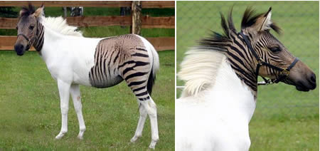 由公驢和母斑馬雜交生下的后代,叫斑馬驢,這種情況存在但很少見。圖片的斑馬驢叫"愛克莉斯"(Eclyse),它的身上只有兩片斑紋,這非常罕見。負(fù)責(zé)它起居的動(dòng)物園員工列達(dá)表示,"愛克莉斯"除外表?yè)碛懈改傅奶卣魍猓愿裆弦噙z傳了他們的特點(diǎn)。