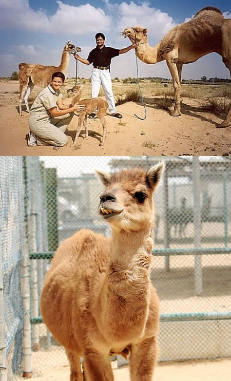 這是一種由駱駝和南美大羊駝通過(guò)人工受精而得來(lái)的混血駱駝(Cama),是1995年于迪拜的駱駝繁育中心誕生的惟一一只。因?yàn)轳橊労湍厦来笱蝰劦捏w型差異過(guò)大--大羊駝比駱駝要小得多,所以通過(guò)自然手段繁育是不可能的?;煅橊劧涞拈L(zhǎng)度介于二者之間,有著像駱駝一樣長(zhǎng)長(zhǎng)的尾巴和適宜沙漠行走的強(qiáng)壯的腿,但和大羊駝一樣都沒(méi)有駝峰且有蓬松的長(zhǎng)毛。