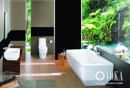 把浴室搬進山林聽起來有些瘋狂,但把“山林野樹”遷入浴室,卻并非完全不可行??吭「椎膲φ尜N上數碼噴繪的自然風景圖片,不出浴室就能體驗到自然之趣。現在有些墻紙專賣店能提供此類的定制圖案壁紙服務