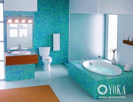 浴室局部墻面和浴缸基座都用深淺不一的藍色馬賽克貼面,營造出海洋般清新開朗的氣質,配合白色的浴室地面,更能起到給視覺降溫的效果。