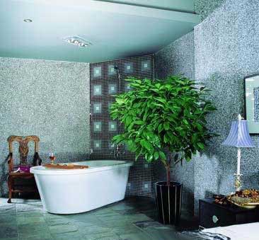 找回屬于自我的生活空間。全開(kāi)放式的浴室與臥室渾然一體,只用吊頂和綠色植物的位置來(lái)進(jìn)行隱性分區(qū),浴缸后面的墻壁用馬賽克鋪貼出方形圖案,既是一種防潮處理,又與周圍灰色的碎石粒墻面形成色彩上的統(tǒng)一。