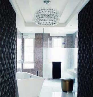 在這樣一個(gè)經(jīng)典空間里,就可以選擇設(shè)計(jì)風(fēng)格一致,但形態(tài)、色彩、質(zhì)感各異的家具。衛(wèi)生間干區(qū)的皮質(zhì)軟墻、濕區(qū)馬賽克的拼貼,造型感十足的玻璃質(zhì)吊燈以及線條明朗的潔具,它們都簡(jiǎn)潔而富有張力,共同打造了一個(gè)質(zhì)感豐富的空間。