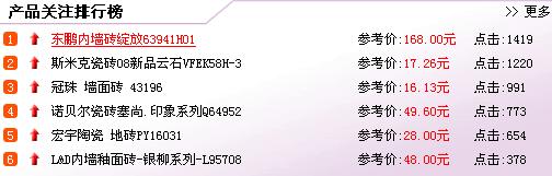 概要: 伴隨著仿歐田園風(fēng)格瓷磚的風(fēng)靡一時(shí),在沉淀著悠久傳統(tǒng)文化的都市里,滲透著文化性和藝術(shù)性的瓷磚正慢慢散發(fā)出耀眼的光芒,更多的建材生產(chǎn)廠家以及更多的設(shè)計(jì)師已經(jīng)把關(guān)注點(diǎn)放在如何提升瓷磚的文化內(nèi)涵上。現(xiàn)如今,瓷磚不再是個(gè)單純的裝修材料概念,而是在藝術(shù)和文化上找到了立足點(diǎn)。通過本周內(nèi)墻磚產(chǎn)品關(guān)注排行榜不難看出,具有文化性和藝術(shù)性的瓷磚已經(jīng)成為今春市場(chǎng)上最受歡迎的產(chǎn)品。