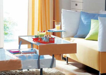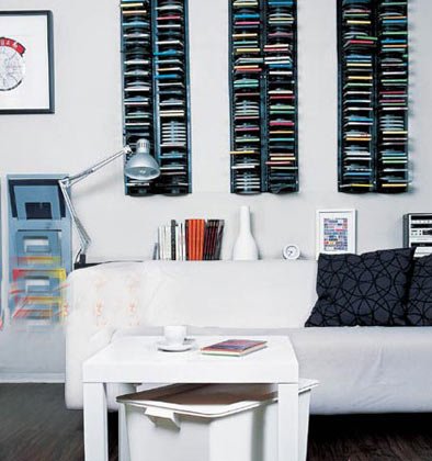 當(dāng)?shù)孛嫔弦呀?jīng)沒有多余空間的時候,我們可以開始打墻面的主意了,沙發(fā)后面的墻壁可以好 好的利用起來。放置豎款CD架,既可以大量地收納CD,也可以作為一種漂亮的展示,同時還可以利用沙發(fā)扶手旁邊的空白墻壁,在這個較低的位置上掛置一個報刊架,沙發(fā)前的茶幾下也有空位,放置一個儲物箱,方便又實用。