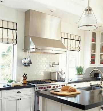 這款廚房它具有一張非常純凈的外表。櫥柜臺面采用精細(xì)打磨的卡拉拉大理石制成。灶具具有六檔火力調(diào)節(jié)。最出彩的在于對抽油煙機的設(shè)計,通過白色瓷磚砌成的墻面精細(xì)的包裹住油煙機,并在墻面上開鑿了擺放調(diào)料等的儲物架既美觀又實用。