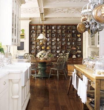 在這個空間里融匯了古代與現(xiàn)代的雙重元素?,F(xiàn)代簡潔的白色櫥柜與古董橡木櫥柜相應(yīng)成趣。古銅餐桌與寫滿滄桑的鐵藝座椅述說著歷史的韻味。一面古董陳列架更是為整個廚房空間增添了時光輪回的感覺。
