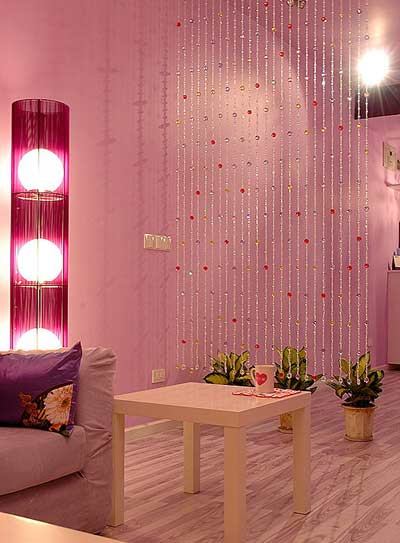 作為隔斷,珠簾的色彩與款式要與居室風(fēng)格色彩協(xié)調(diào)。例如,溫馨浪漫風(fēng)格適合粉色、紫色,款式可以使用水晶珠簾;清爽簡(jiǎn)約風(fēng)格適合環(huán)串式的水晶珠簾,以藍(lán)白色為宜;時(shí)尚感強(qiáng)的居室則適合用紅色、綠色等色彩鮮艷的珠簾搭配;但歐美古典風(fēng)格當(dāng)然還是使用透明的水晶最顯高貴了。
