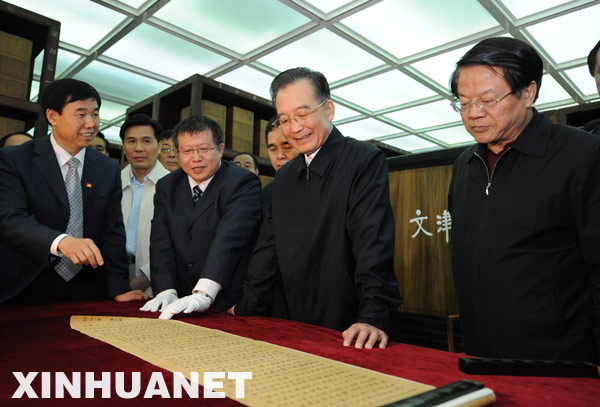 4月23日是“世界讀書日”。國務(wù)院總理***來到商務(wù)印書館和國家圖書館,與編輯和讀者交流讀書心得。這是***在國家圖書館欣賞館藏珍品。